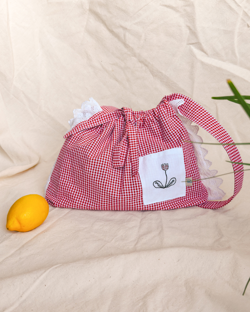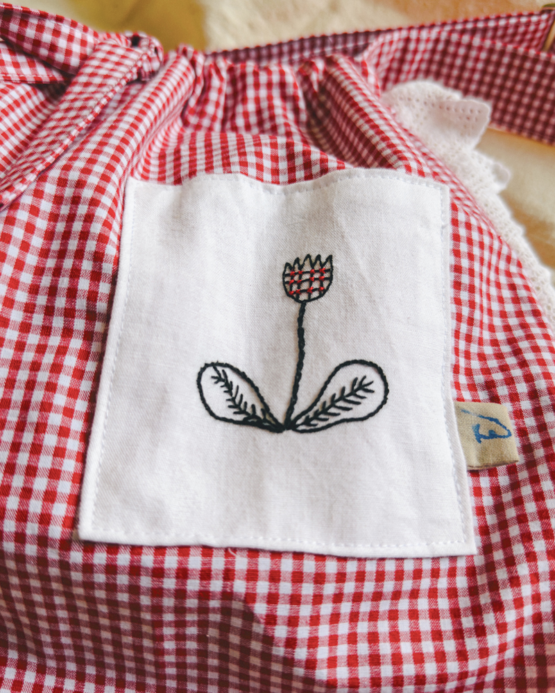• En tissus vichy rouge et dentelle et broderie florale